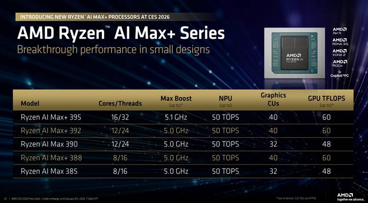 除了锐龙AI 400系处理器之外,AMD也补充了目前图形性能最强的锐龙AI Max+处理器家族,推出了锐龙 AI Max+ 392以及锐龙 AI Max+ 388处理器,其中前者为12核24线程,后者是8核16线程,与上一代产品相比保留了完整的GPU以及NPU规格,GPU核心单元及其浮点运算能力显著提升,从而更加适合AI创作者,并且原汁原味地保留图形性能也可以让掌机厂商受益匪浅,将锐龙AI Max+处理器带入到掌机中,让其拥有不逊于游戏主机的图形体验。