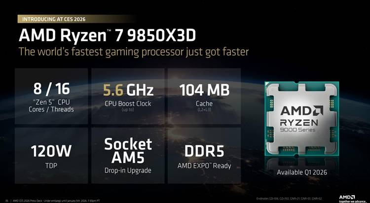 对于游戏玩家来说,AMD锐龙9000X3D系列处理器的推出无疑是天降紫微星,得益于超大的3D缓存,让处理器的游戏性能提升极其明显,从而让X3D处理器成为了AMD手中的杀手锏,这种优势在游戏中体现得淋漓尽致。这一次的CES 2026上,AMD推出了锐龙7 9850X3D处理器,在原有处理器的基础上增加了频率,从5.2GHz提升到5.6GHz,这多出来的400MHz的频率可以让处理器在许多电竞游戏中表现得更加出色,与Intel酷睿Ultra 9 285K处理器相比,AMD锐龙7 9850X3D处理器可以拥有平均27%的游戏性能提升,当之无愧地成为了游戏玩家心目中的白月光。