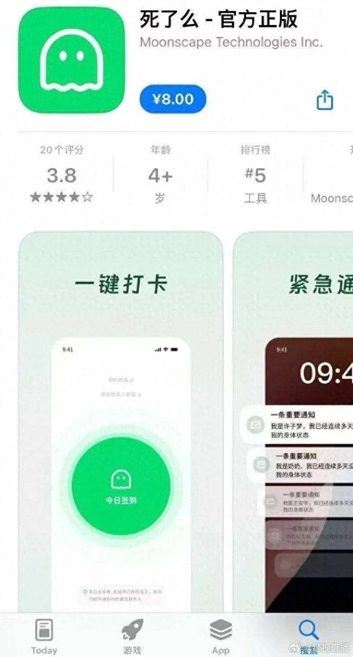 据广州日报,1月8日,苹果应用商店一款名为“死了么”的App受到关注。截至发稿时,该款App在苹果付费软件排行榜位列第一。
