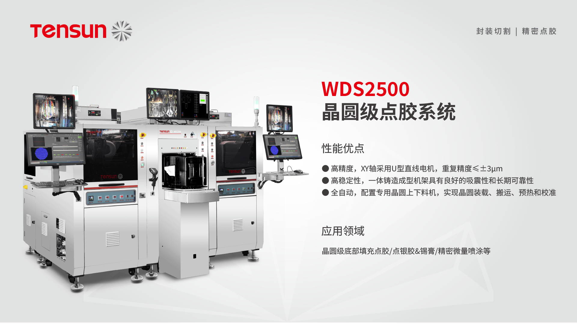 腾盛精密成立于2006年7月,专注于精密点胶和精密划切设备的技术创新与研发,产品应用于『半导体』封装行业。该公司掌握了丰富的『半导体』封装制程工艺解决方案,其精密点胶机主要应用于晶圆级封装(WLP)、基板级封装(SLP)、面板级封装(PLP)中的倒装球栅格阵列封装(FCBGA)、倒装『芯片』级封装(FCCSP)、系统级封装(SiP)等制程中的精密点胶工艺,包含Underfill、Lid Attach 、Dam&Fill、Glob Top、Solder Paste & Silver Adhesive Dispensing、Solder Line Dispensing等工艺。