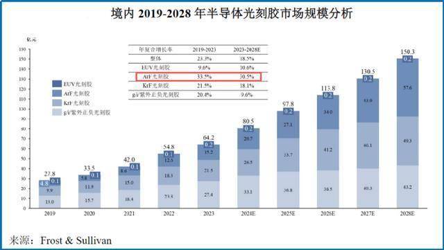行业测算,到2028年我国境内『半导体』光刻胶市场规模有望达到150亿元,其中ArF光刻胶对应市场规模49.3亿元,占比达32.8%。
