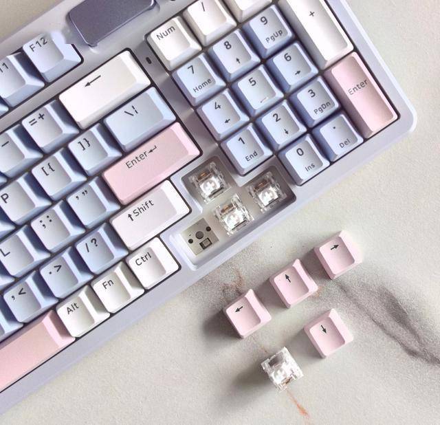 先来说说键盘,我入手的是雷柏V700DIY-98长续航版本,确实让我体验到了不一样的感觉,相比于这款键盘的丝滑和手感,传统的薄膜键盘在使用时更像有一种泥泞感。外观方面,我选择的莫奈仙踪,也就是蓝白粉的配色,既有科技感又不显张扬,搭配本人猛男的气质也不违和,反而能凸显一抹精致。紧凑的98%配列布局也是深得我心——它完整保留了数字小键盘,对于经常需要处理数据、填写表格的我来说,效率提升是立竿见影的。同时,相比全尺寸键盘,它的布局更加紧凑,整体的尺寸也小了不少,为本不宽裕的办公桌上留出了更多的空间。