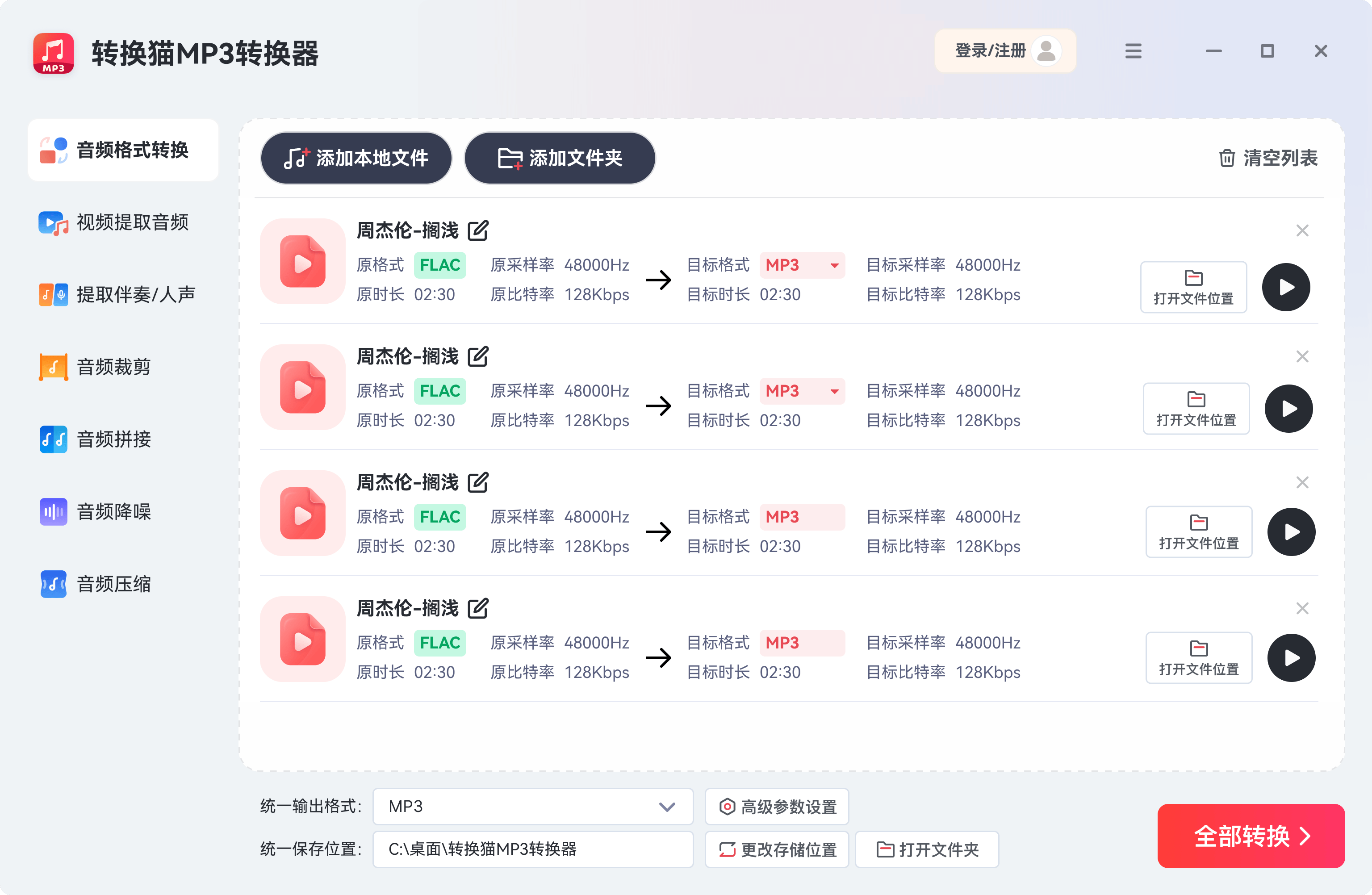 2、设置栏中,将“目标格式”选择为MP3。建议在“声道”选择立体声,“采样率”设为44100Hz。确认无误后,点击右下角的“全部转换”大按钮。转换完成后,软件会自动弹出提示,直接点击“打开文件夹”即可看到新鲜出炉的MP3。