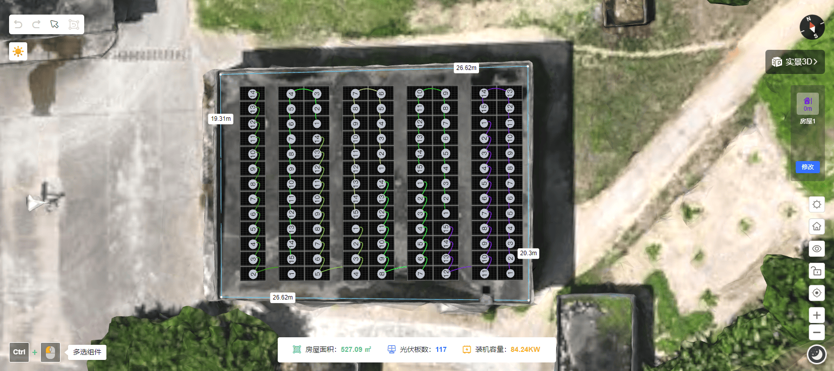 在3D模型里直接做设计模型生成后,可直接在3D场景中完成光伏设计(比如区域绘制、组件排布)和电气设计(逆变器型号、线路走向、设备布局),三维视角下能更直观地规避空间冲突、优化方案,效率直接拉满!