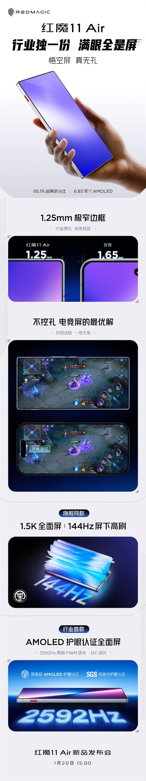 快科技1月14日消息,今日,红魔11 Air手机官宣将搭载 6.85英寸AMOLED悟空屏,采用真无孔设计,屏幕占比达95.1%,边框宽度仅1.25mm,官方称其为“电竞屏的最优解”。