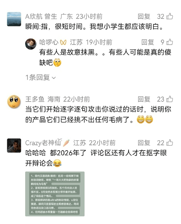 在评论区,不少网友开始正向解读“200公里瞬间刹停”。有网友并表示:“今日霍州一样用‘瞬间’来表达速度非常快的意思,也没人会无聊到去质问这瞬间究竟是多久,能不能用瞬间形容,非拿这个表达主观感受的常见用词说事的人,只能说是故意针对小米挑刺找茬了。”