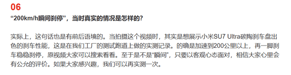 “实际上,这句话也是有前后语境的。当拍摄这个视频时,其实是想展示小米SU7 Ultra碳陶刹车盘出色的刹车性能,这是在我们工厂的测试跑道上做的实测记录。的确是加速到200公里以上,再一脚刹车稳稳刹停,原视频大家可以搜索看看。