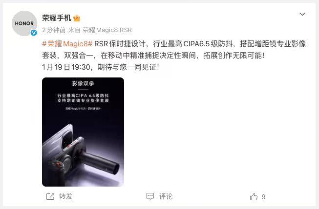 荣耀宣布,将于1月19日发布的Magic8 RSR保时捷设计手机将搭载CIPA 6.5级防抖系统。该防抖等级为目前行业公开数据中的较高标准。