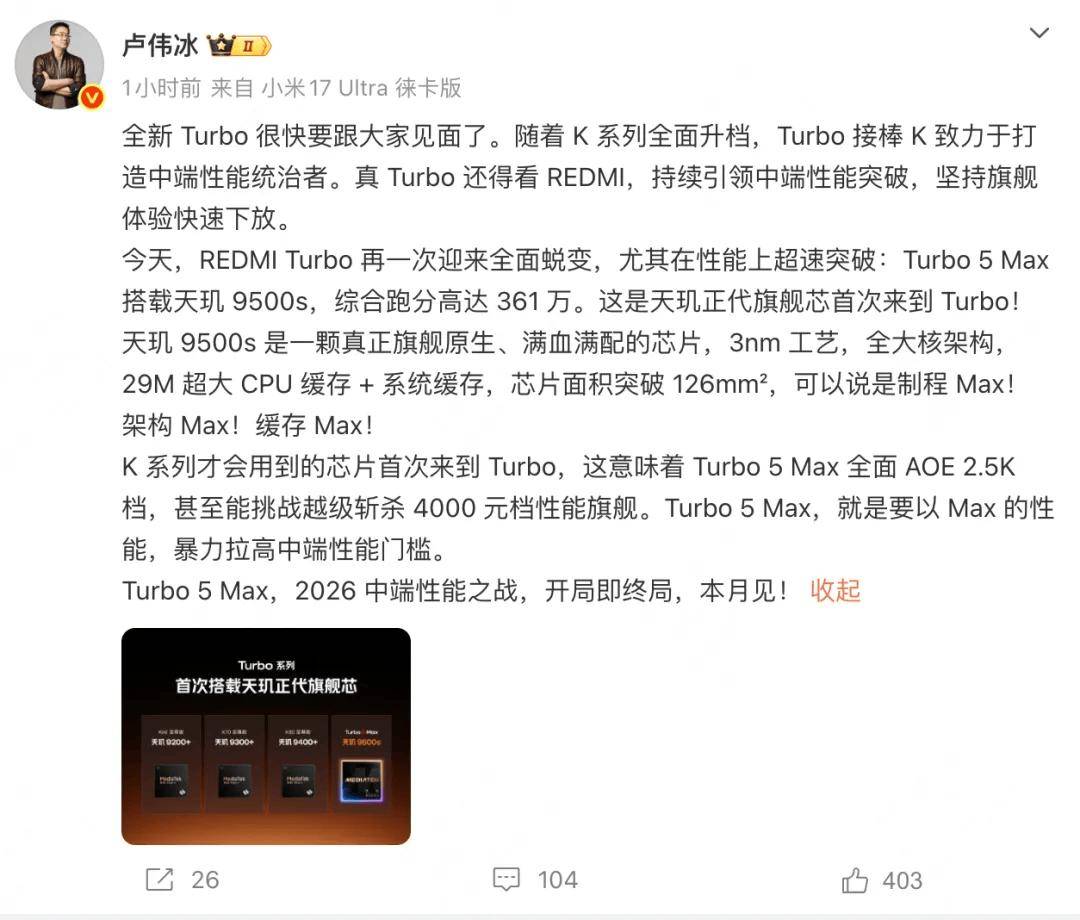 1 月 15 日消息,小米集团合伙人、总裁、手机部总裁及小米品牌总经理卢伟冰今日发文,正式预热 REDMI Turbo 系列新品 ——REDMI Turbo 5 Max。该机定位2.5K 档满血性能旗舰,全球首发与联发科技联合定义的天玑 9500s 『芯片』,将接棒 K 系列打造中端性能统治者,综合跑分高达 361 万,越级挑战 4000 元档性能旗舰。