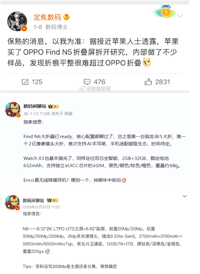 而被苹果“盯上”的OPPO,新作Find N6已爆出猛料:全球首款『骁龙』8E5大折叠,2亿像素+6000mAh+大电池,轻薄机身兼顾性能与续航,还首次支持AI书写笔,2月即将首发!这波技术积淀拉满,值得蹲守~