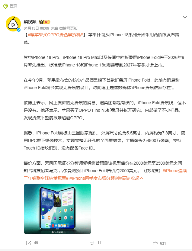 大V 定焦数码 直言:“消息保熟保真!苹果折叠屏样品折痕控制仍难超OPPO,这波是国产技术被行业巨头盖章认可”。