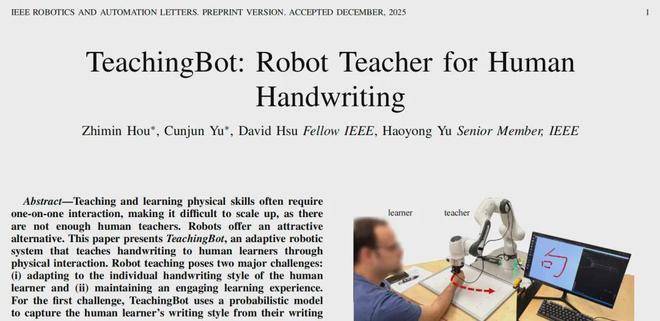 有没有想过,『机器人』️不仅能搬东西、做手术,还能当你的书法老师?近日,一项名为TeachingBot的自适应『机器人』️教学系统在国际顶级期刊《IEEE Robotics and Automation Letters》上亮相。它通过物理交互,教人类学习者书写汉字,能真正看懂每个人独特的书写习惯,然后手把手地、循序渐进地教你写出漂亮的汉字。研究团队来自香港岭南大学数据科学学院、新加坡国立大学计算机学院以及生物医学工程系,结合了跨学科的创新力量,推动了『机器人』️技术在教育领域的应用。