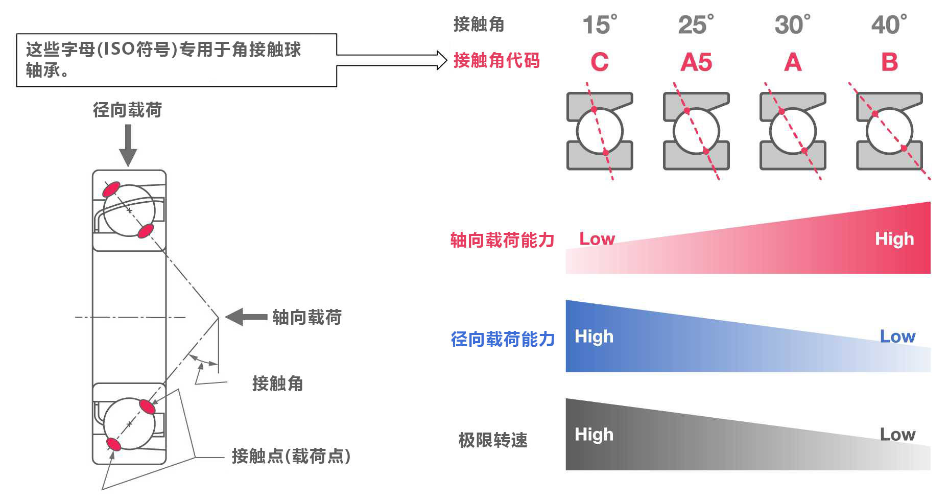 - 接触角(15°、25°、40°等)决定轴向承载能力