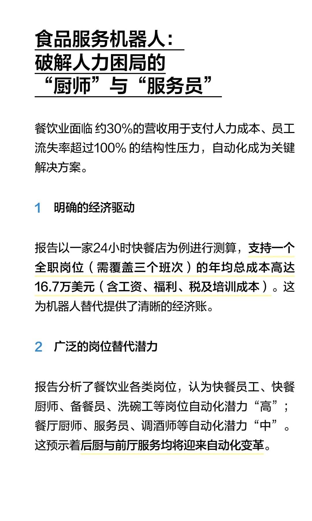 三、食品服务『机器人』️:破解人力困局的“厨师”与“服务员”1. 明确的经济驱动