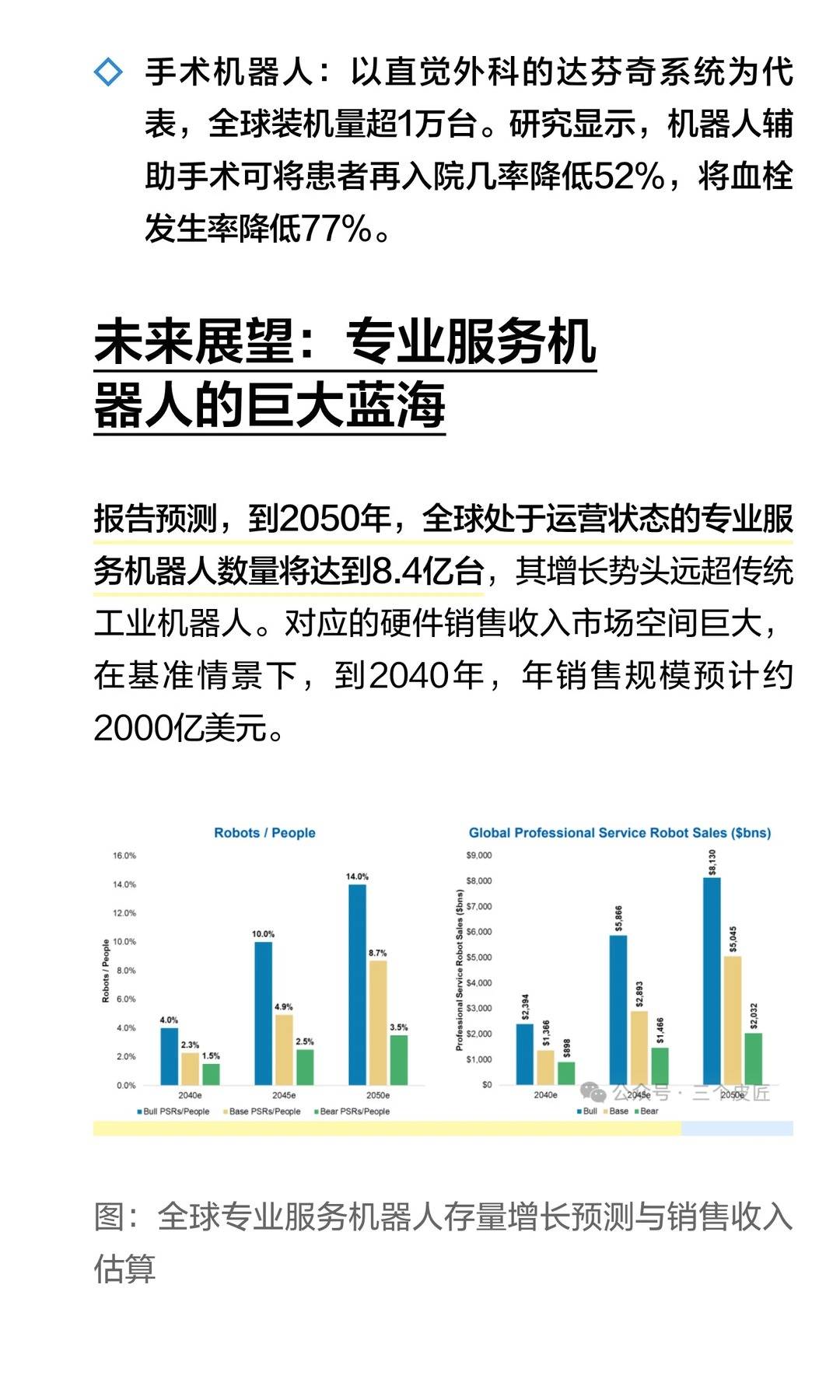 五、未来展望:专业服务『机器人』️的巨大蓝海报告预测,到2050年,全球处于运营状态的专业服务『机器人』️数量将达到8.4亿台,其增长势头远超传统工业『机器人』️。对应的硬件销售收入市场空间巨大,在基准情景下,到2040年,年销售规模预计接近2000亿美元💵。