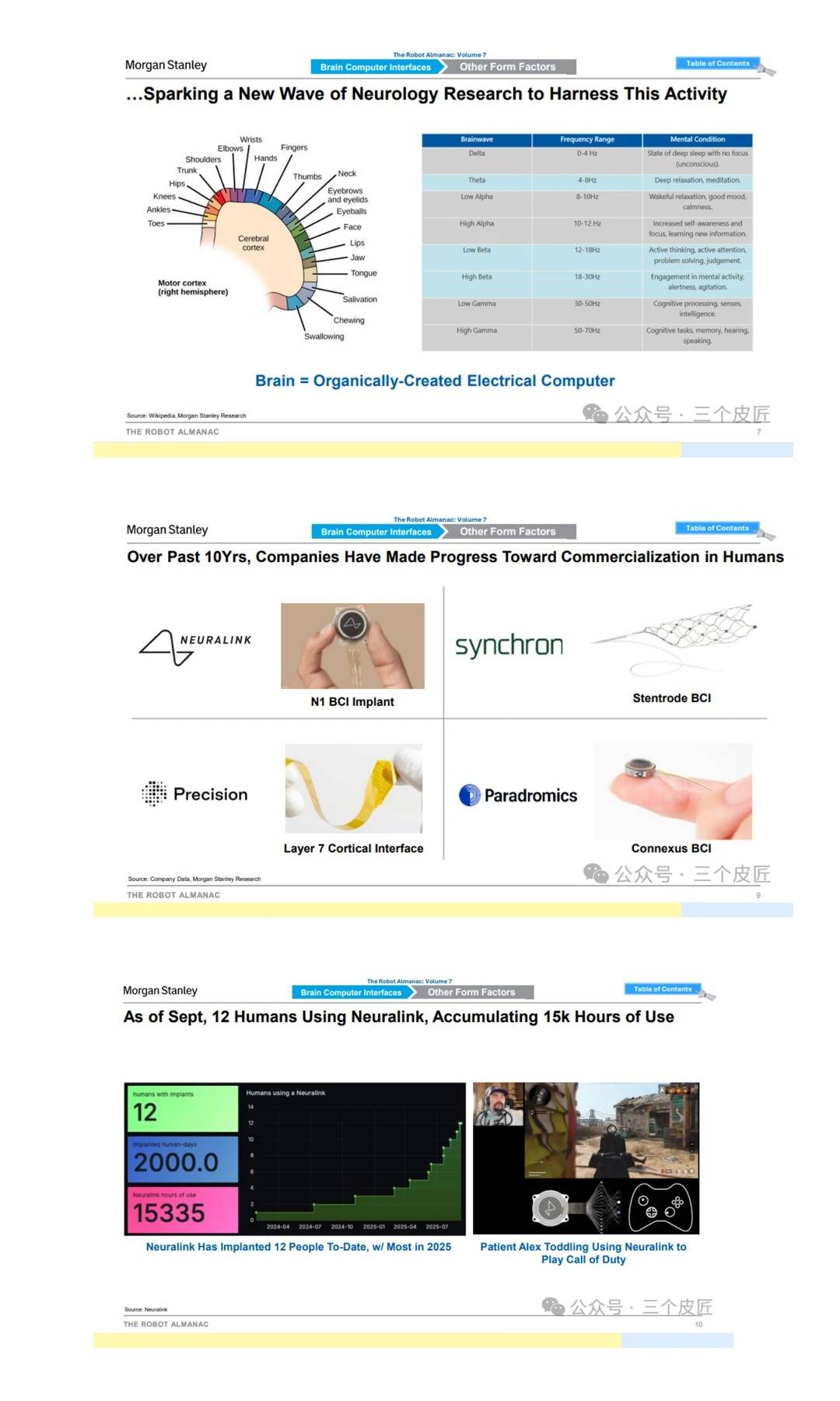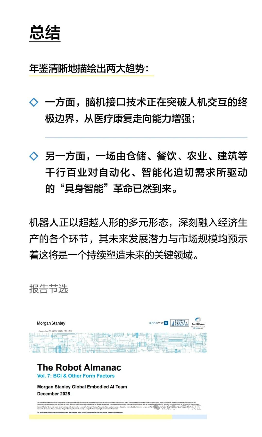 2025年12月22日,摩根士丹利全球具身人工智能团队发布了《『机器人』️年鉴:第七卷:脑机接口(BCI)与其他『机器人』️形态》,报告深入剖析了脑机接口技术的演进与商业化进程,以及除人形『机器人』️外,在其他各垂直领域蓬勃发展的『机器人』️形态。