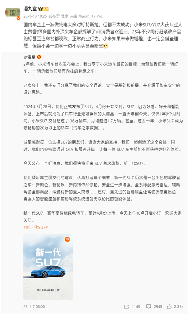 潘九堂,国内车企上一波做纯电大多对标特斯拉,但都不太成功,小米SU7/YU7大获专业人士赞誉(很多国内外顶尖车企都拆解了)和消费者欢迎后,25年不少同行赶紧改产品路标甚至连命名都现改,也是正常的商业行为。