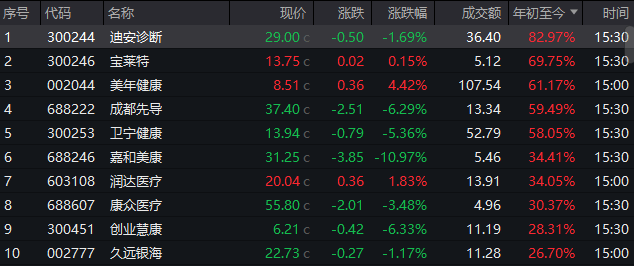 但今年以来,AI医疗概念火爆。自1月5日起,多只个股已积累较大涨幅,迪安诊断(300244.SZ)涨超80%,泓博医药涨超70%,宝莱特(300246.SZ)、美年健康(002044.SZ)涨超60%,成都先导、卫宁健康(300253.SZ)等涨超50%。