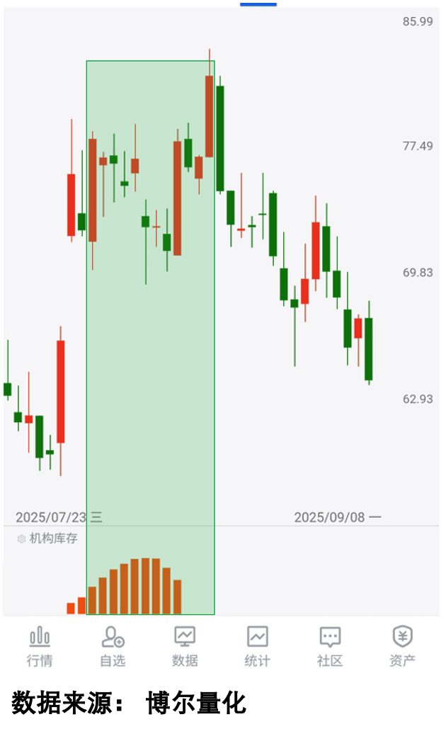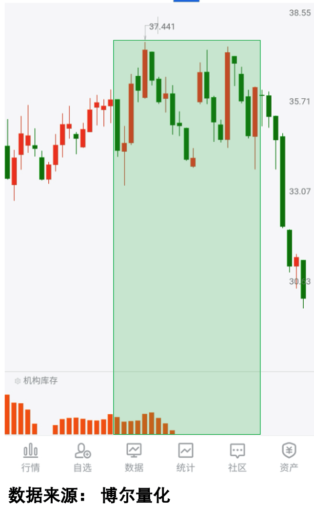 再看另一只标的,反弹力度看起来更大,更容易让人动心。但如果结合量化数据看,就会发现反弹过程中「机构库存」根本没出现,说明没有机构资金积极参与,这种反弹只是表面热闹。看图2。