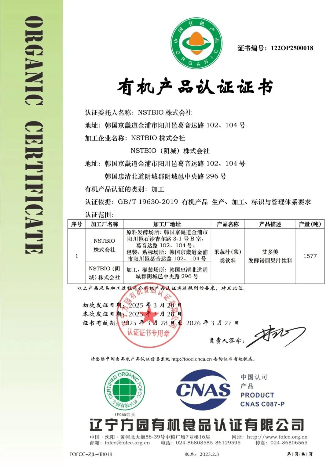 艾多美发酵诺丽果汁饮料荣获中国国家有机产品认证,该认证由中国权威机构依据国际通行的有机标准严格审核,涵盖原料种植、生产加工到终端交付全流程,要求产品完全避免合成化学物质、转基因成分及环境污染。