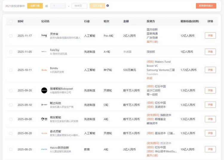 毫无疑问,AI玩具是在国外先开出了花,但是凭借遥遥领先工业增加值,AI玩具在国内结出的果实更丰硕。除了海量中国AI玩具涌现在CES 2026上之外,资本也相当看好AI玩具产业前景,正在快速涌入这一领域,根据IT桔子数据统计,截至2025年11月17日,国内AI玩具产业在2025年内融资次数已经达到21起,当中更不乏亿元级别的投资,吸引了红杉中国、金沙江创投、龙湖资本、深创投等头部投资机构参与。代表性案例是AI玩具企业跃然创新(Haivivi)在2025年8月完成2亿元A轮融资,获得融资后公司估值达10亿元。