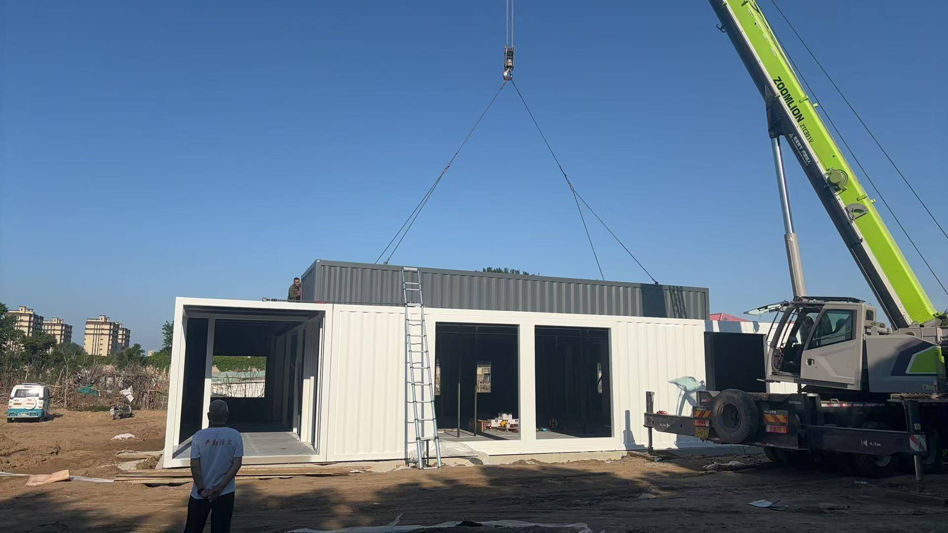 前期筹备:精准规划与协同 2025年4月底设计交底后,5月劳动节期间上海集装客迅速启动筹备。团队深入研究项目地址——河北廊坊广阳区万庄镇的场地条件,协调预制模块生产排期,确保铝合金门窗、钢板等材料供应与模块生产节奏匹配。同时,与甲方及相关单位沟通,明确主体结构地基及室外景观施工标准,为现场施工扫清障碍。