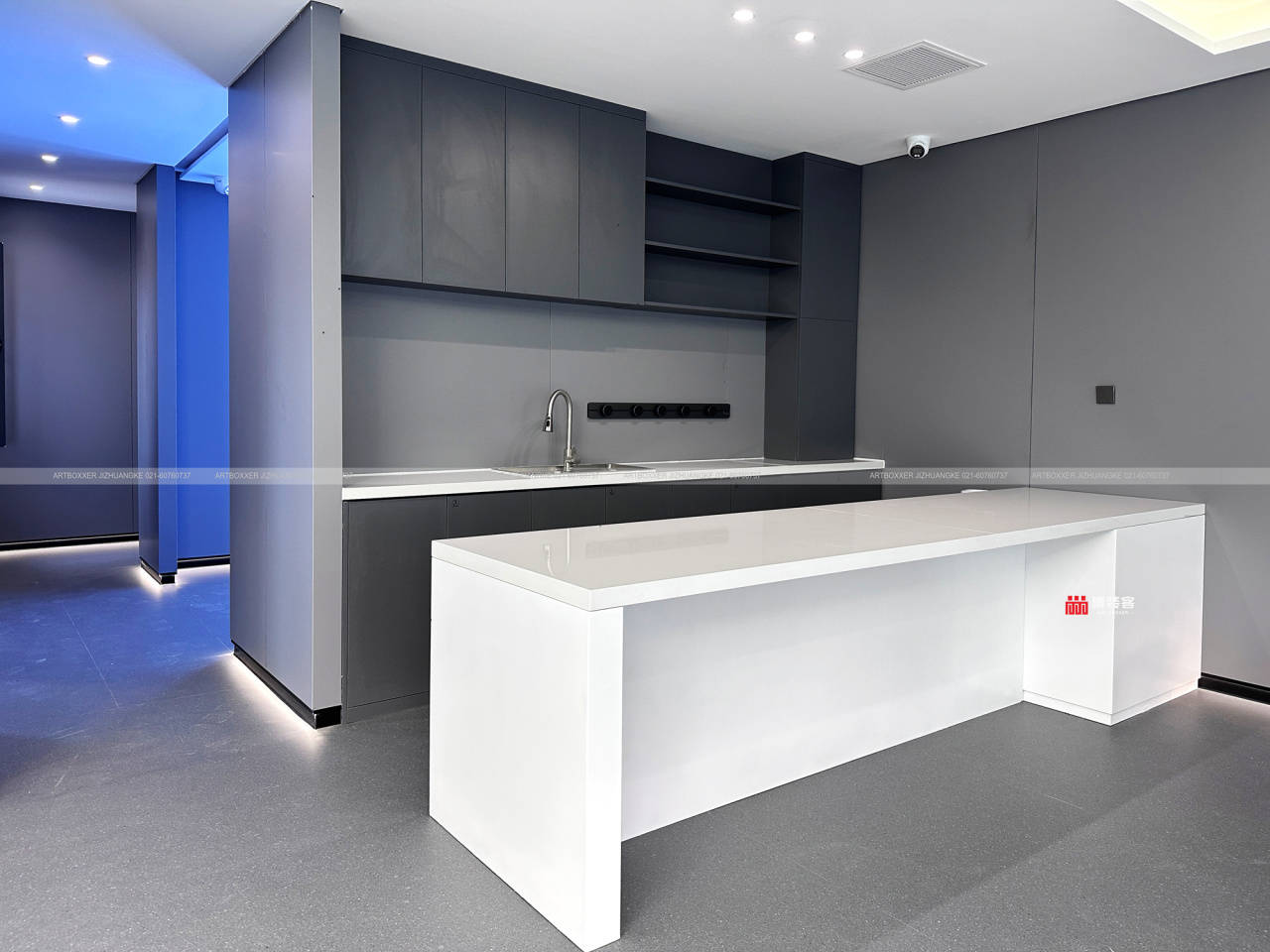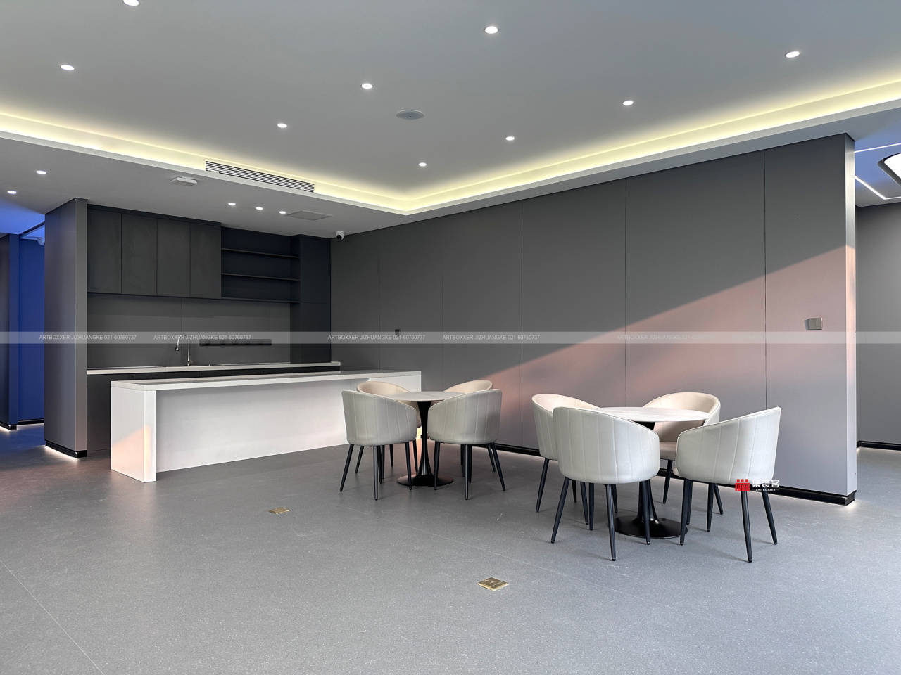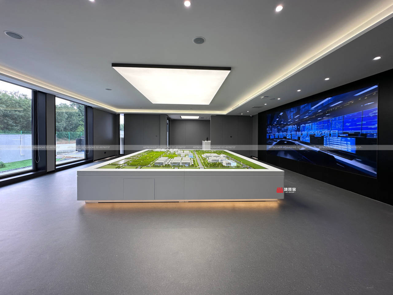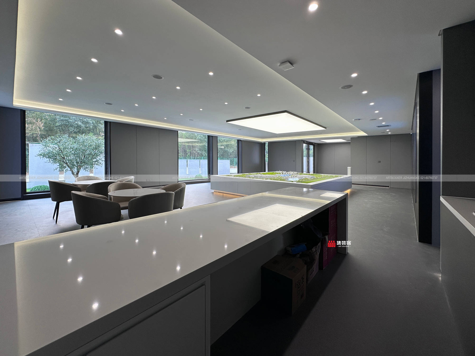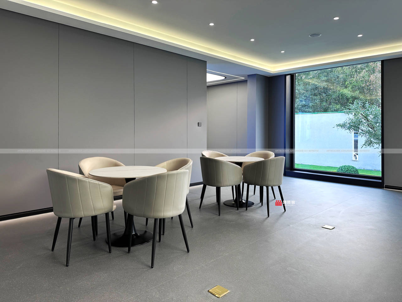 室内200多平的空间,围绕接待与展示核心功能布局。开放式洽谈区采用简约灰色质感为主色调,碳晶板、同透地胶等材料打造的地面与墙面,质感细腻且耐用。大面积玻璃窗将室外绿意引入室内,模糊空间边界,让来访者在交流中感受自然与科技的融合。