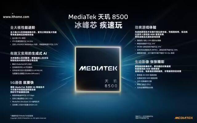 今天(1 月 15 日),2026 联发科天玑『芯片』新品发布会举行,首先带来的是天玑 8500 『芯片』。