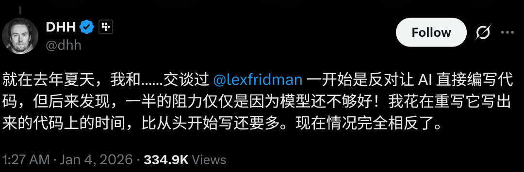 还记得传奇程序员 Ruby on Rails 之父 DHH 吗?去年他还在访谈里吐槽 AI 编程,说它生成的代码全是漏洞,修一个错能引十个新错。结果没几个月,画风直接反转,他公开承认 AI 编程是真好用。