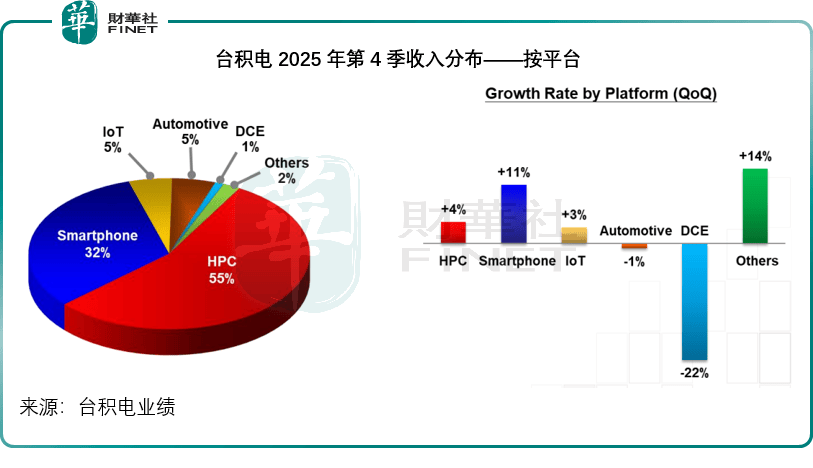 从平台来看,高性能计算(HPC)依然是其最大的收入来源,于2025年第4季的收入占比达到55%,较上年同期高出2个百分点,但较上季低2个百分点;智能电话的占比则维持在32%的水平,较上年同期低3个百分点,但较上季增长2个百分点。