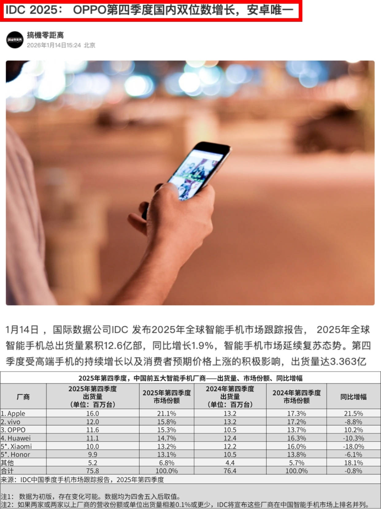 市场的反馈是最诚实的。在刚刚过去的2025年第四季度,国内『智能手机』市场整体同比微降,而OPPO成为了国内市场『安卓』阵营中唯一实现同比增长的品牌;在全球范围内,它也是中国头部厂商中唯一实现逆势增长的品牌。