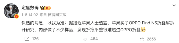 近日有消息指,苹果买了OPPO Find N5折叠屏拆开研究,内部做了不少样品,发现折痕平整很难超过OPPO折叠。也就是说,目前网上疯传的“无折痕iPhone Fold”目前还没真正完成,最终表现如何还是得等9月份苹果发布会。