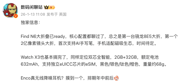 此外,OPPO Find N6疑似还将是第一台『骁龙』8 Elite Gen5折叠+最大电池(6000mAh)的折叠+第一台2亿像素国产折叠,属于是把技能树点满了。