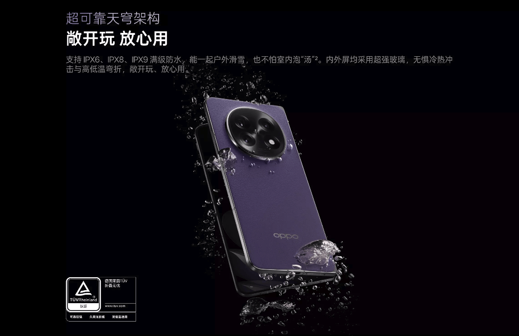 回顾上一代 OPPO Find N5,它在耐久性上已经交出了一份让人满意的答卷。全球首款通过 IPX6、IPX8、IPX9 的满级防水认证折叠旗舰,让折叠屏告别“旱鸭子”;钛合金天穹铰链的应用,不仅降低了厚度,更让强度提升不少;还拿下全球首个德国莱茵 TÜV 无感折痕、折叠无忧双认证,OPPO 用实打实的产品力告诉用户:折叠屏也可以耐用。