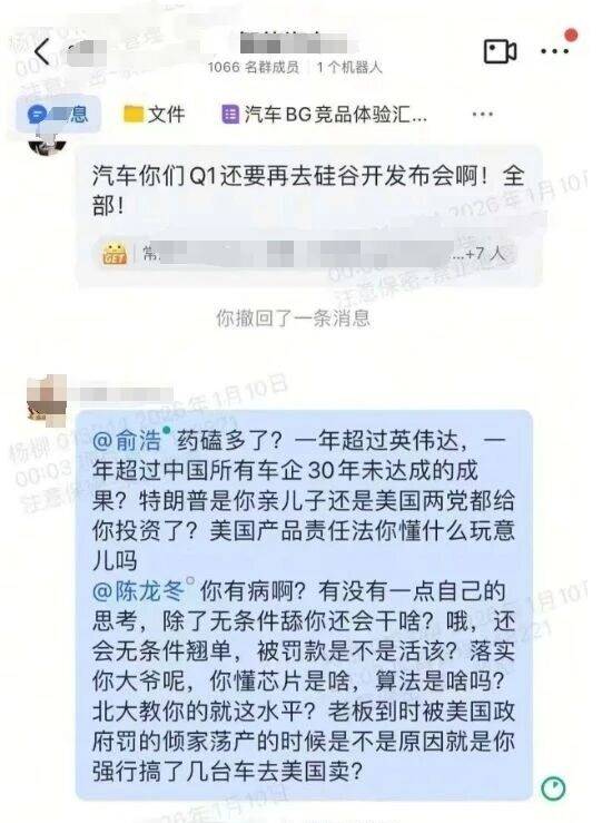 从流出的截图能看到,这个工作群有1066名成员和1个『机器人』️,氛围本来挺平静,直到这名员工@俞浩,话里带着火药味:“药磕多了?一年超过『英伟达』,一年超过中国所有车企30年没达成的成果?特朗普是你亲儿子还是美国两党都给你投资了?美国产品责任法你懂什么玩意儿吗?”一连串问题,把俞浩之前放的“豪言”怼得明明白白。