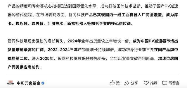 另外,智同科技展现出强劲的增长势头。2024年全年出货量较上年增长一倍,成为中国RV减速器市场出货量增速最高的厂商,2022-2024三年产销量增长持续翻倍,成功跻身行业前三并在国产品牌中稳居第二位。进入2025年,智同科技继续保持领先势头,全年出货量突破再创新高,增速位居国产同类供应商前列。