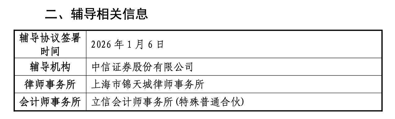 本次IPO的辅导机构为中信证券股份有限公司,律师事务所为上海市锦天城律师事务所,会计师事务所为立信会计师事务所(特殊普通合伙) 。
