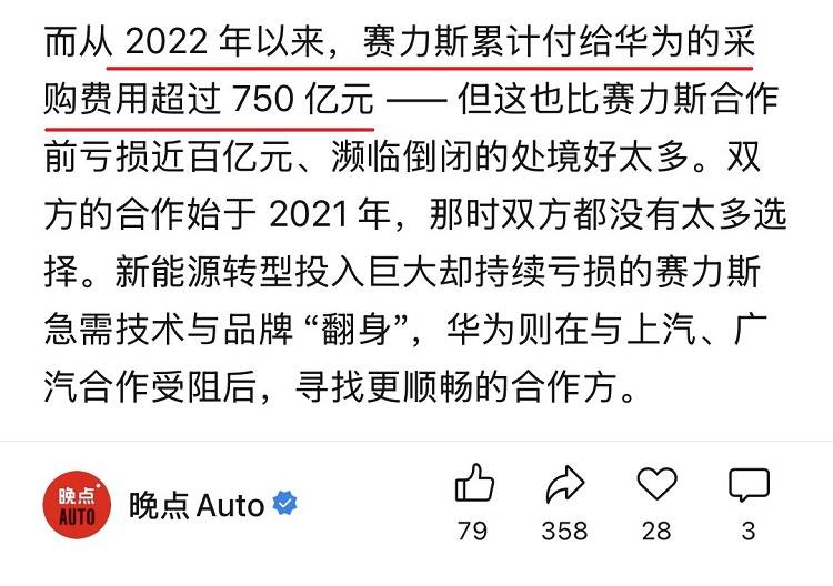 内容显示,自 2022 年赛力斯与华为深度合作以来,赛力斯累计给华为支付了 750 亿元的采购费用。