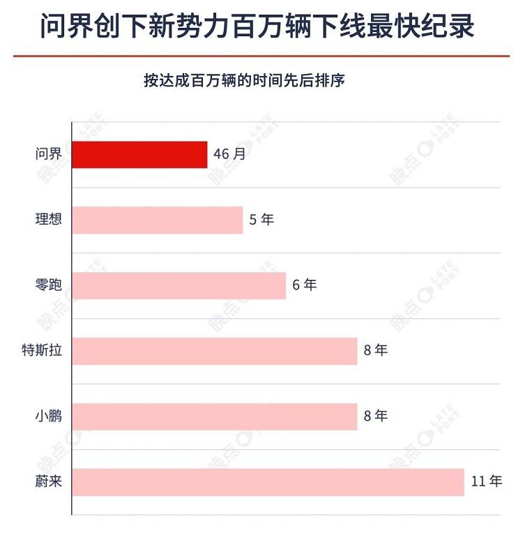 数据显示,在华为的助力下,问界只用了 46 个月,就达成百万辆新车下线目标。而同样完成百万新车下线目标,理想用了 5 年,零跑用了 6 年,特斯拉用了整整 8 年。