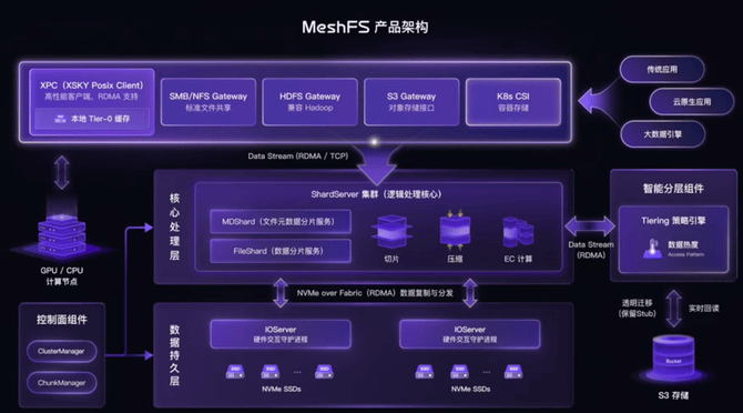 第一堵墙是IO墙。当算力吞吐速度远超存储读写能力时,GPU被迫空转,造成巨大资源浪费。XSKY的解决方案是MeshFS并行文件系统,该系统融合了XGFS成熟协议栈与XSEA全闪底座的极致性能。