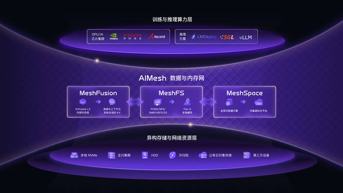 据了解,AIMesh是专为AI场景打造的全栈AI数据方案,定位为面向“AI工厂”的数据与内存网,由三大核心组件构成:训练数据网MeshFS、全局对象网MeshSpace、推理内存网MeshFusion。