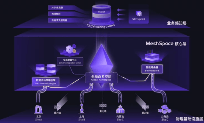 第二堵墙是重力墙。随着数据规模从TB跃迁至PB甚至EB级,跨域流动成本急剧上升,形成新的数据孤岛。XSKY的应对之策是MeshSpace全局非结构化数据平台。