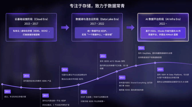 从2015-17年的软硬件架构解耦,打破集中式存储硬件黑盒;到2017-22年的XEDP统一数据平台,打通协议壁垒;再到2022年预判AI趋势,投入研发XSEA全闪底座和EasyData数据管理平台,XSKY十年技术演进呈现出清晰的战略连贯性。