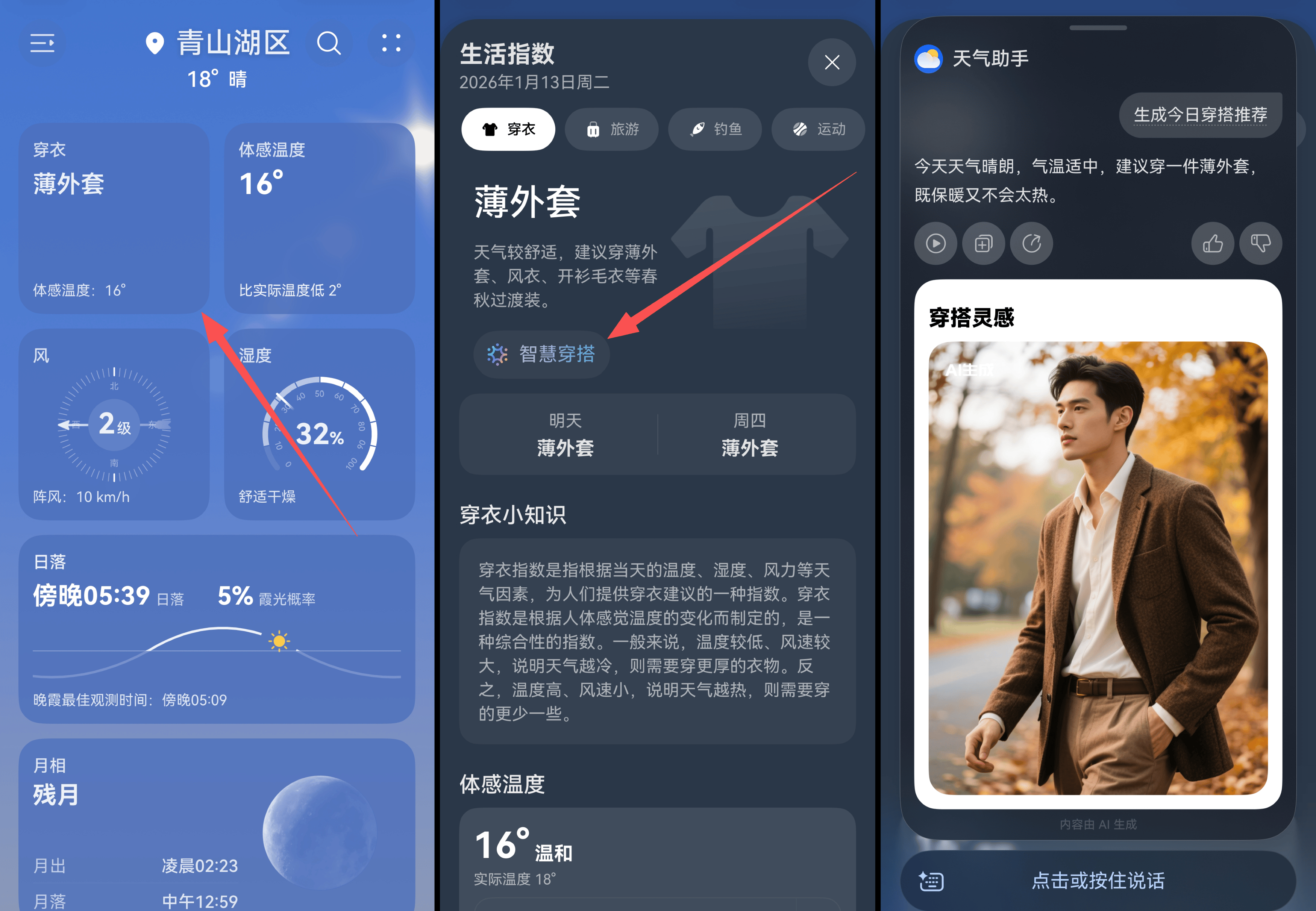 看完了天气,穿什么衣服却成了下一个难题。尤其是马上要过年了,走亲访友的场合变得特别多。去爷爷奶奶家要穿得暖和体面,同学聚会想轻松有型,全家拜年还要喜庆舒服。这时候『穿搭』助手就像我的私人搭配师,它不光按实时天气给建议,还能针对不同场合生成搭配图。这样早上再也不用对着衣柜发呆,省心不少。