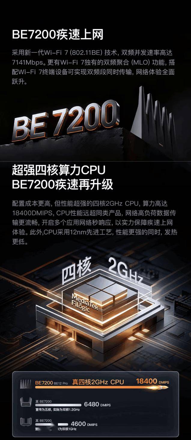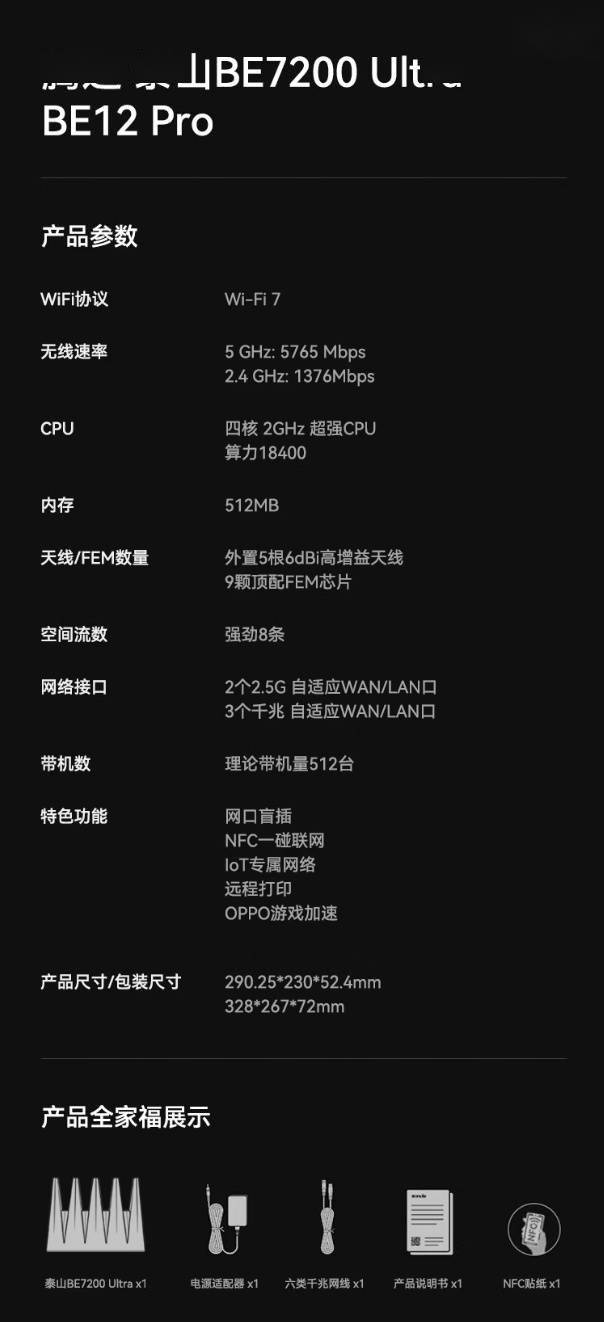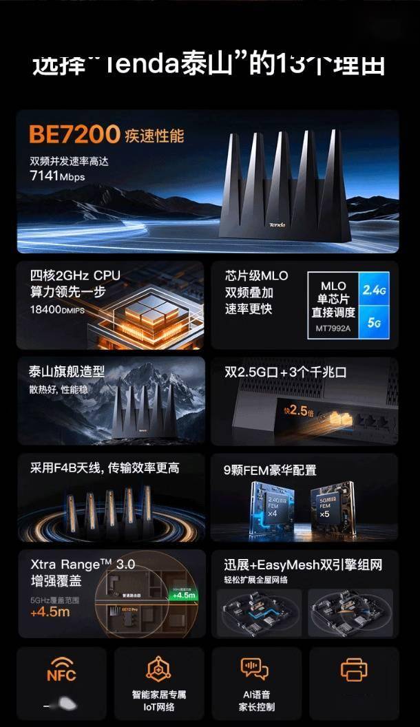 获悉,腾达泰山 BE7200 Ultra 路由器采用了五天线设计,集成 9 颗 FEM,其中 4 颗负责 2.4GHz、5 颗负责 5GHz。产品支持 Wi-Fi 7,双频并发速率可达 7141Mbps,配有四核 2GHz CPU,算力可达 18400 DMIPS,还配有双 2.5G 口 + 3 个千兆口。