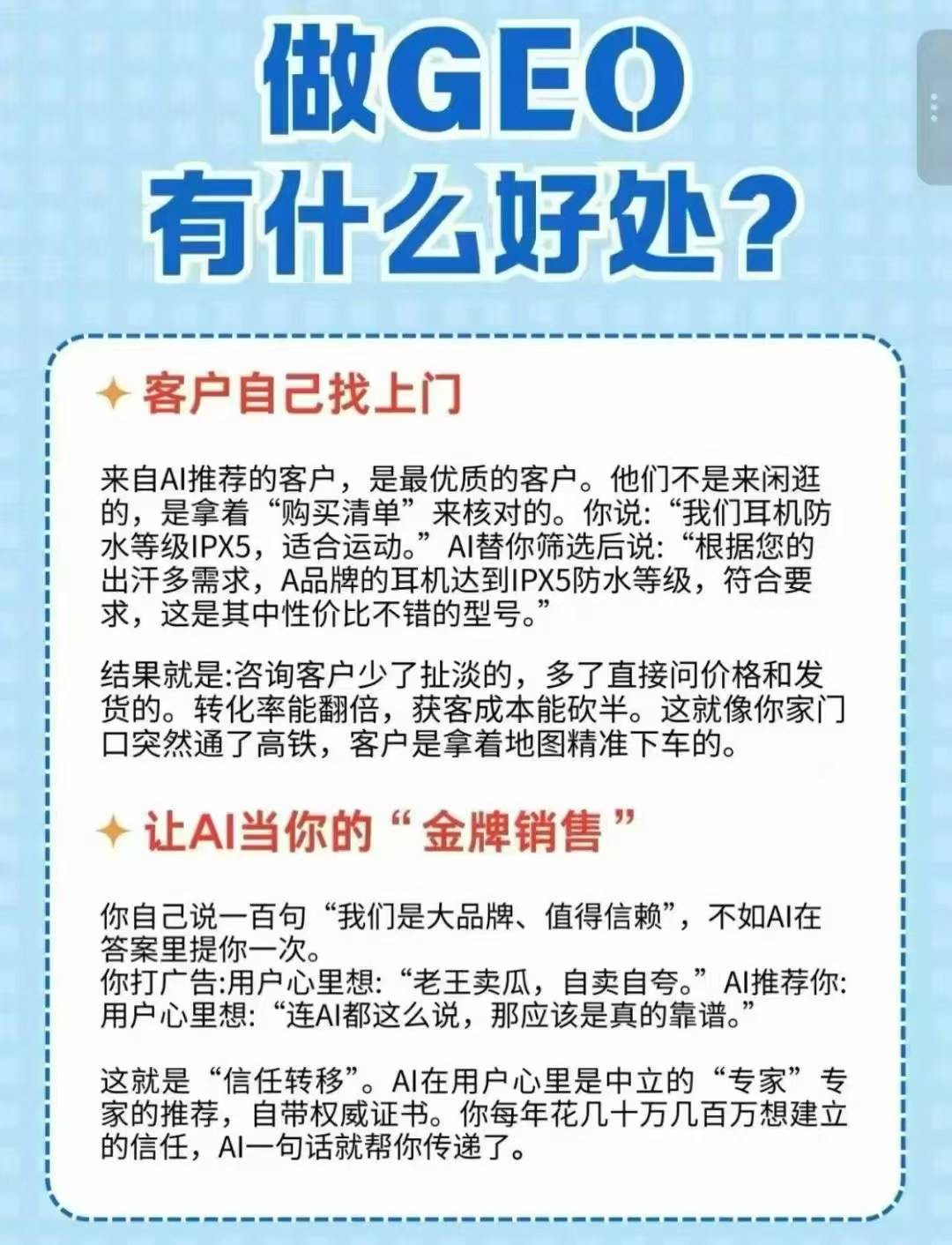 在AI推荐场景下,用户的需求极为明确,有68%的用户决策依赖AI推荐,并且72%的用户认为AI推荐比广告更为可信,这使得转化路径更短、效率更高。GEO推广系统能够精准地捕捉到用户在AI平台上的需求,将品牌信息精准地推送到目标用户面前,从而大大提高了品牌的曝光度和转化率。