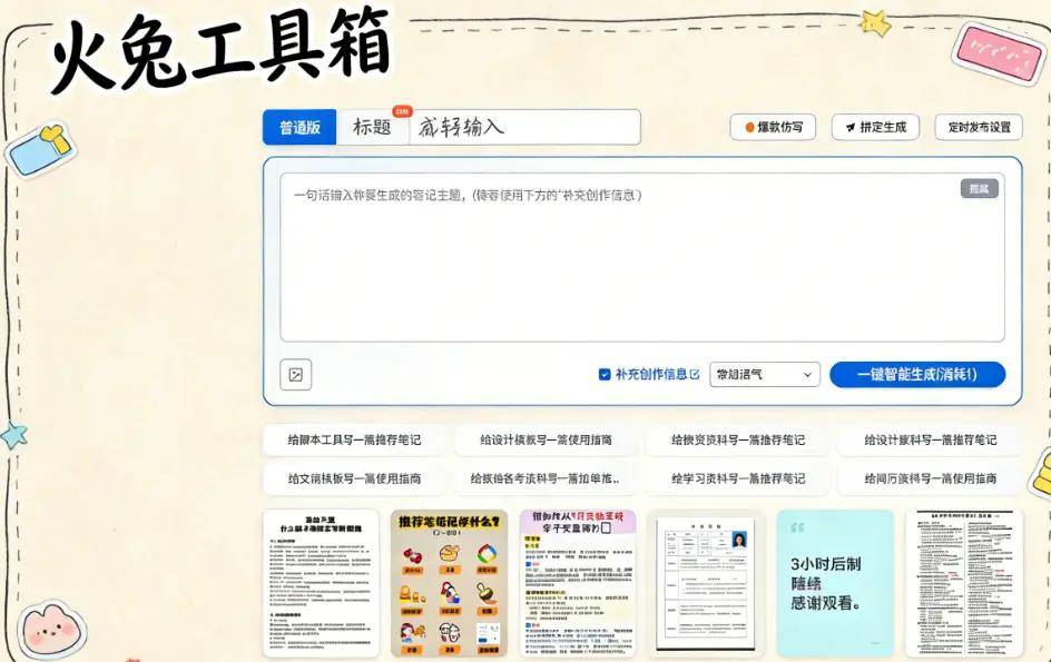 很多运营新手甚至资深博主,都在陷入“无效创作”的怪圈:花3小时写文案、2小时找配图、1小时调排版,最后产出的笔记还没流量,反而被琐碎流程耗光创作热情。更扎心的是,别人一天能更3篇优质图文,你三天才磨出1篇,差距全在工具上——而火兔工具箱🧰,就是帮大家跳出这个怪圈的全能内容创作助手。