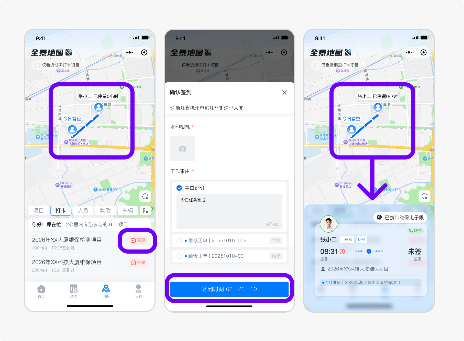 - 全景地图联动打卡:全景地图新增打卡模块,支持基于地理空间的项目打卡,直观呈现外勤人员位置与项目关联,统筹管理更高效。