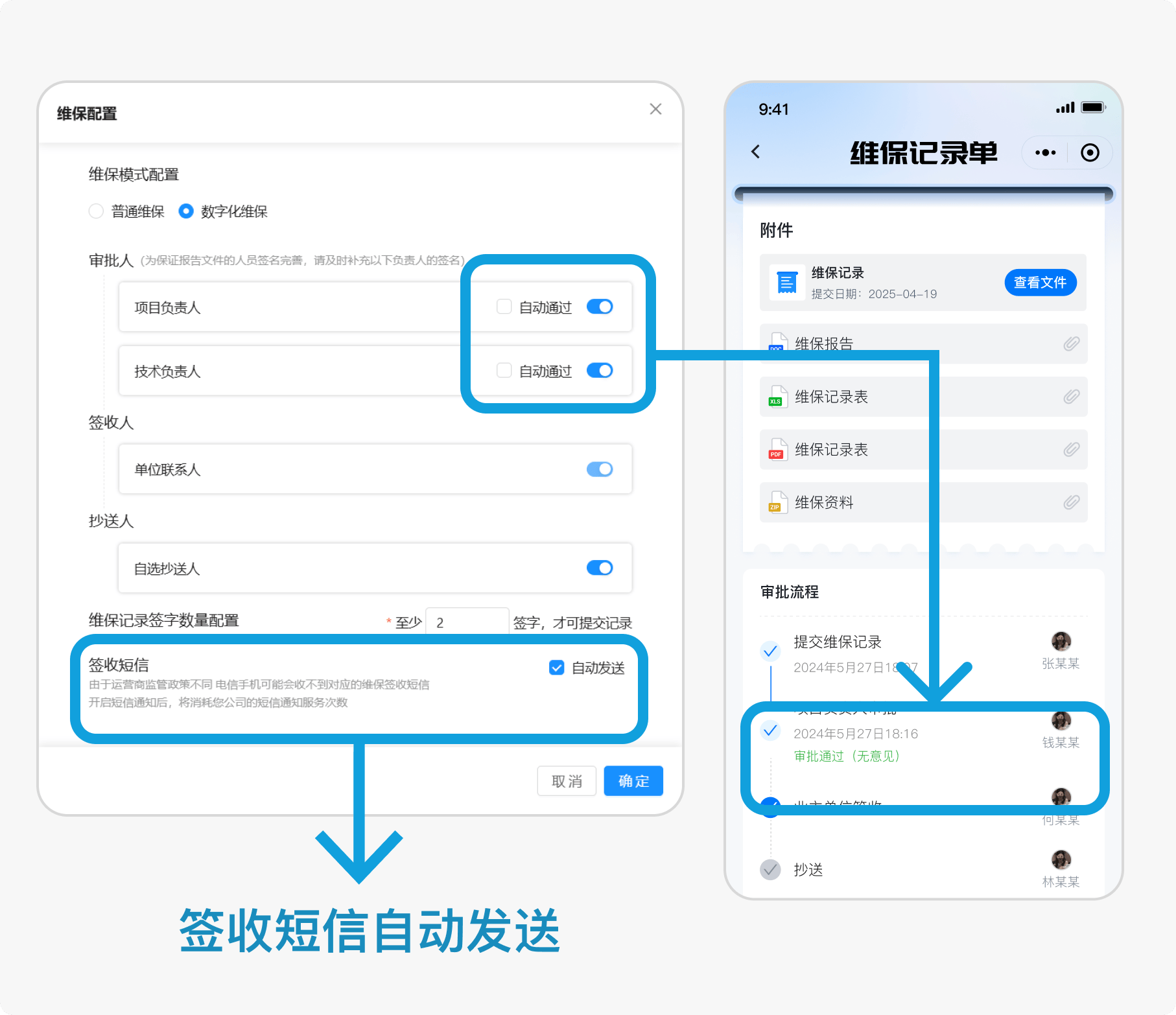 - 维保审批与通知优化:PC端维保配置,审批节点增加自动通过功能;增加自动发送短信的配置项。