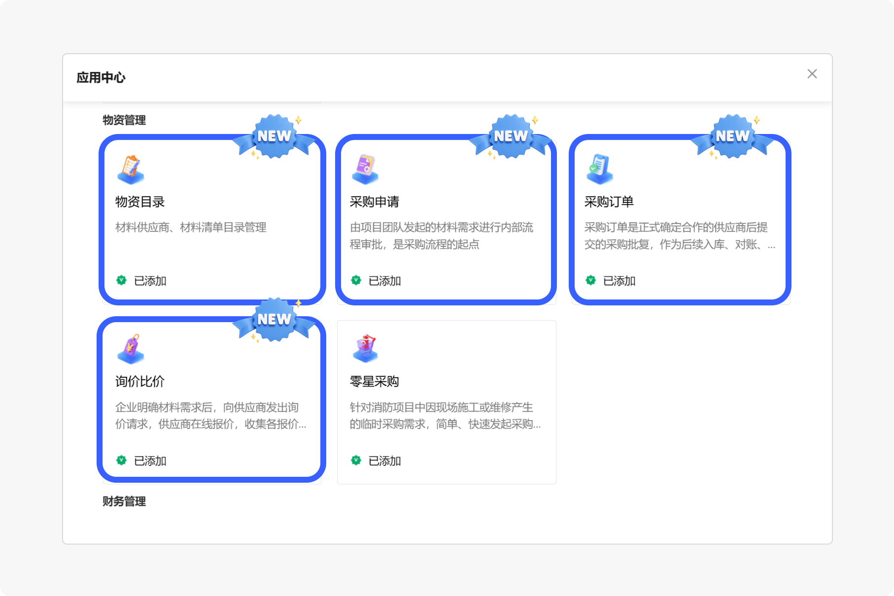- 新增PC端采购全模块:新增【物资目录】【询比价】【采购订单】【采购申请】模块,从需求发起至订单落地,采购环节一站式管控,告别线下繁琐对接。